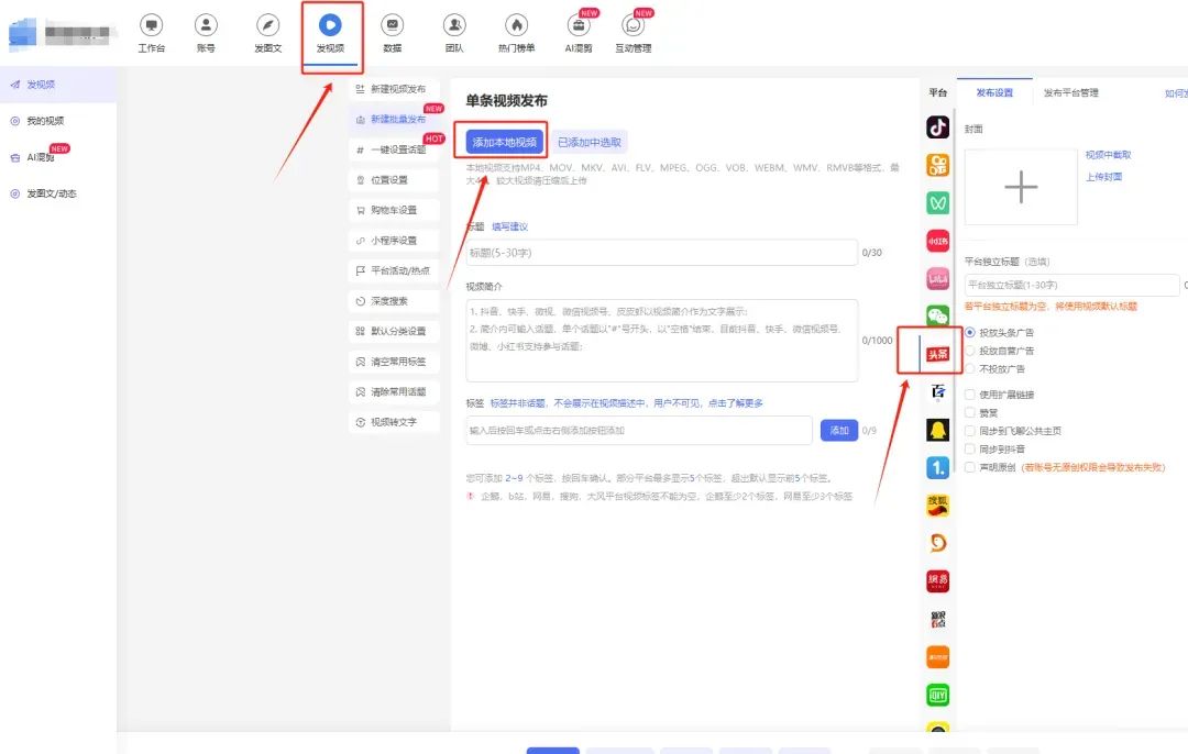 选好要发布视频的平台后,再点击【添加本地视频】来发布视频。