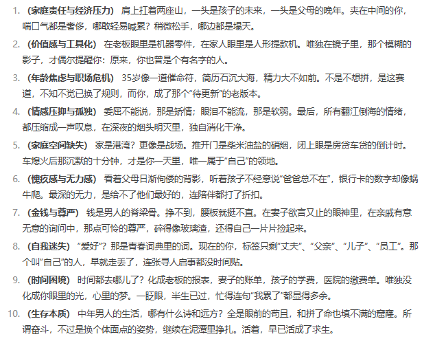 手把手实操一、Deepseek出提示词Deepseek:https://chat.deepseek. com/提示词1:你是一个顶级的情感文案博主,深知中年男人的责任家庭工作生活等痛点,请写10段引发中年男人情感共鸣的情感语录,字段不能超过80字。