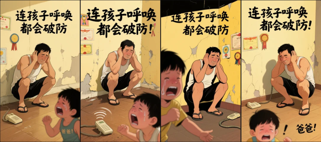 提示词2:插画写实漫画风格,中景画面,40岁亚洲男人穿背心、黑短裤、人字拖捂耳蹲墙角,虚焦前景孩子哭喊”爸爸”,催债电话在地板震动 -画面顶部粗黑手写字体:”连孩子呼唤都会破防” –泛黄色调,墙皮脱落露出童年奖状。