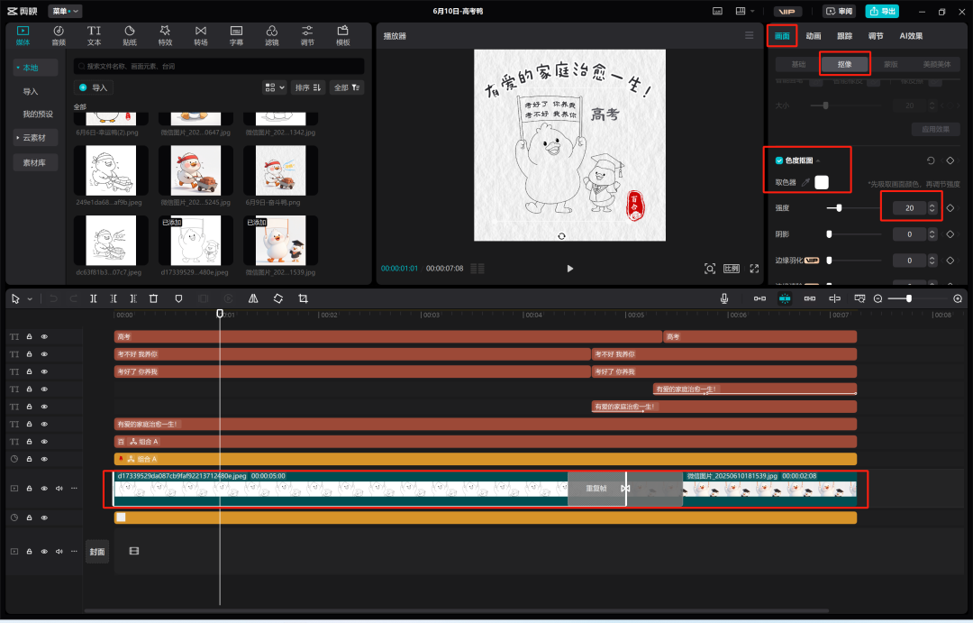 抠图处理,选中图片【画面-抠像-色度抠图】,选中图片的白色背景,去掉白色背景后主体画面跟纸质融合的更加自然,两张图片做同样的处理就完成了。
