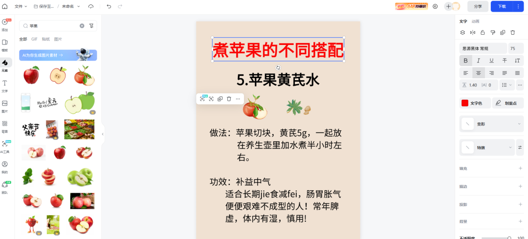 接着直接用小程序提取小红书笔记文案,然后复制然后粘贴到作图工具里面从新在排版一下,在工具的右侧可以调整字体字样,左侧的工具可以找一些图标,没有透明图标的可以某度找到后在上传使用。