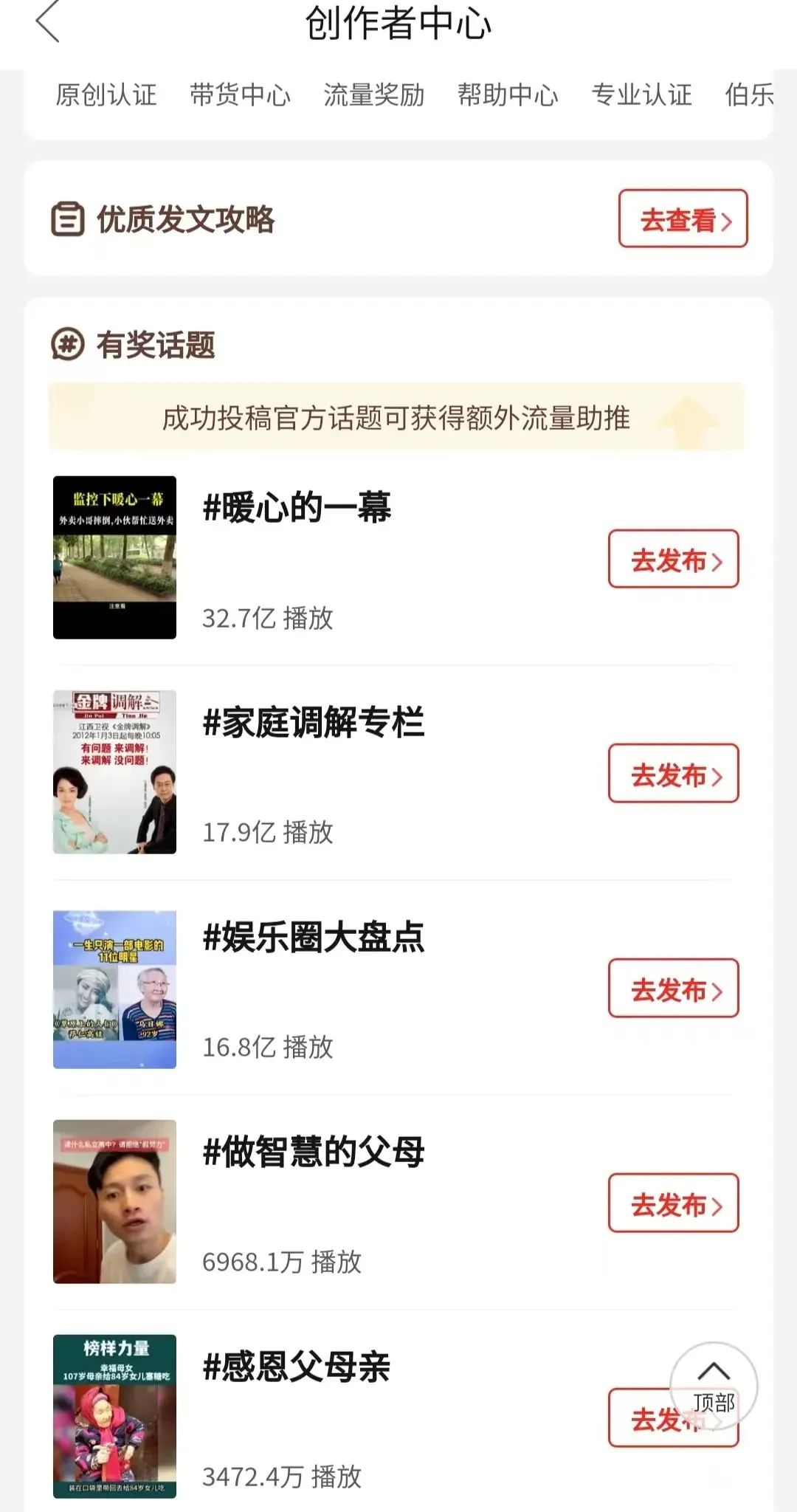 利用平台热点关注创作者中心中的“有奖话题”,上传内容时带上相关话题标签。符合话题的内容可以获得流量助推,更容易上热门。