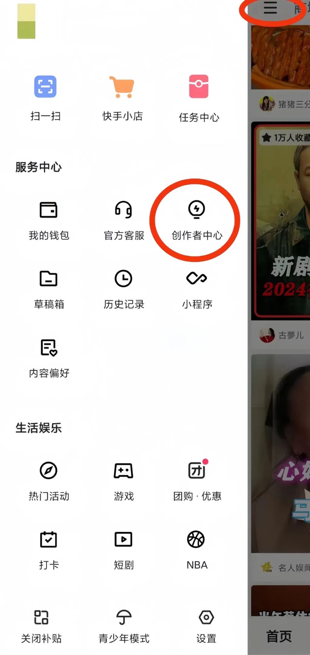 开通路径:左上角【三条杠】-【创作者中心】,看下图: