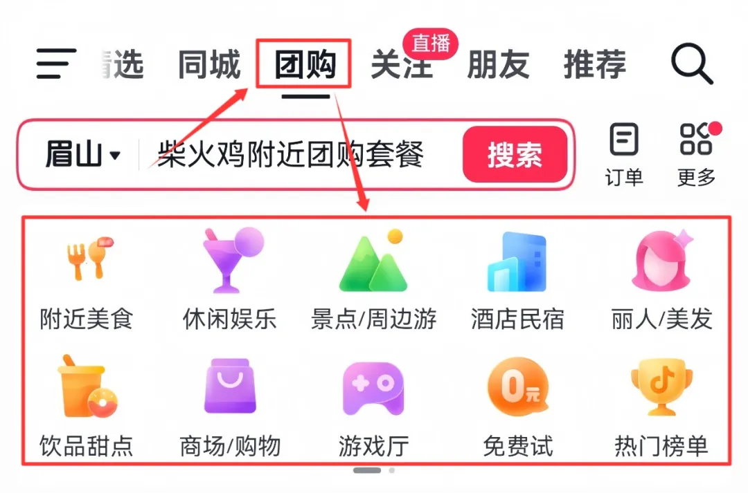打开你的抖音APP,顶部的导航栏里有团购板块,点击后直接跳转。