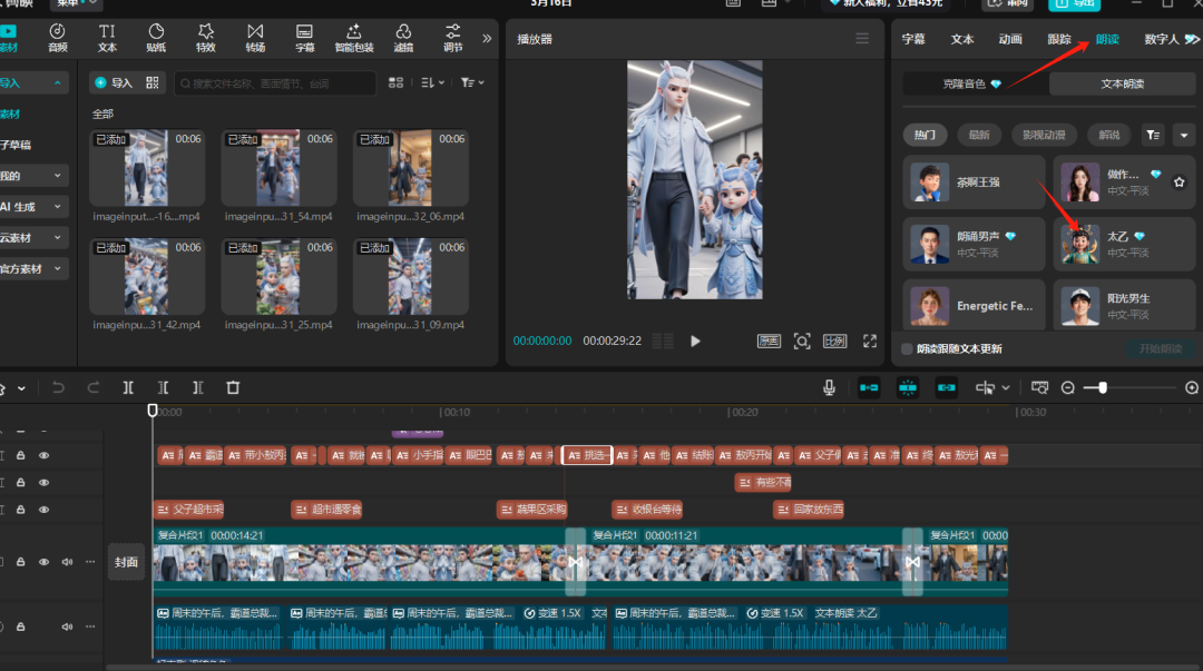 剪映有很多自带的配音不错,比如我们用太乙真人的配音,把旁白生成配音,然后根据音频去剪辑即可。