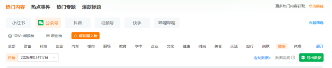 首先直接在浏览器搜索“新榜”,左下角有个“热门内容”这一项,可以参考里面的“10W+爆文”“低粉爆文榜”。,点进去选择自己的领域再做参考就好。