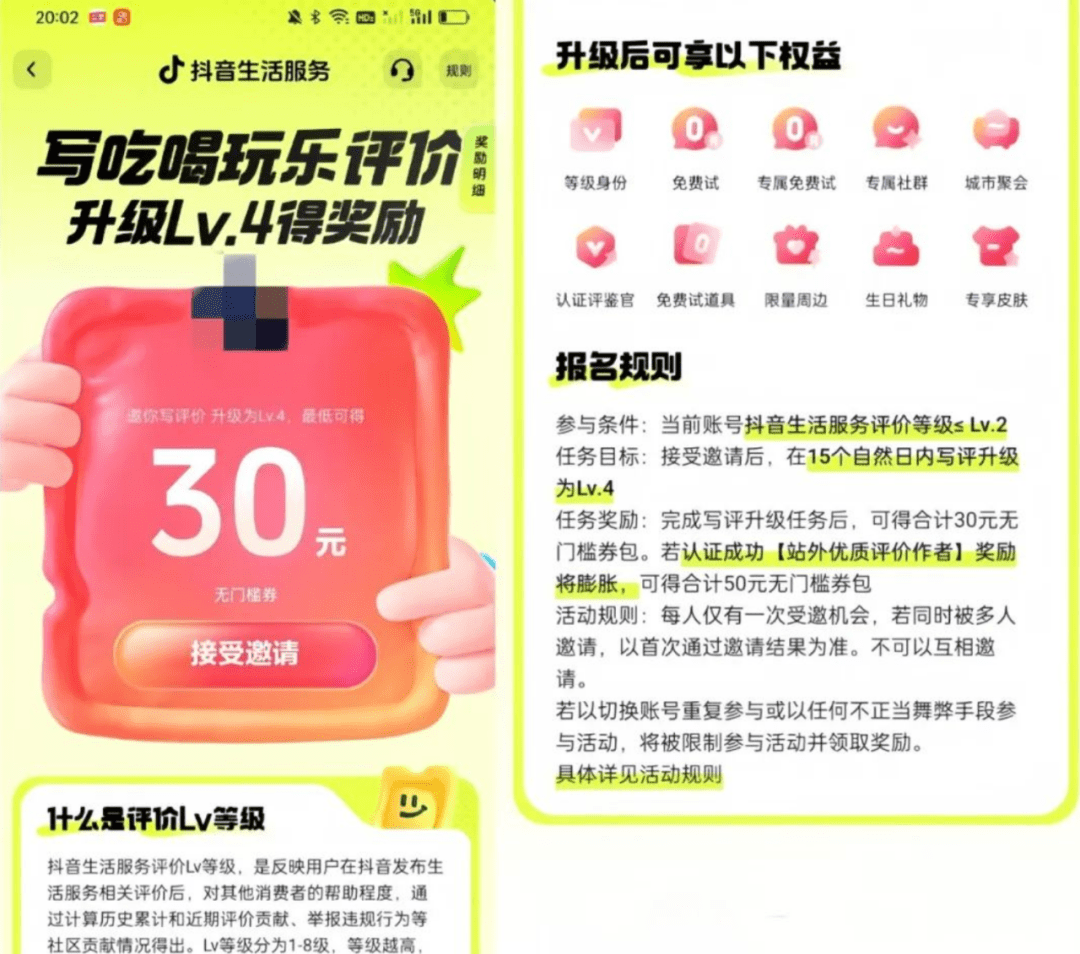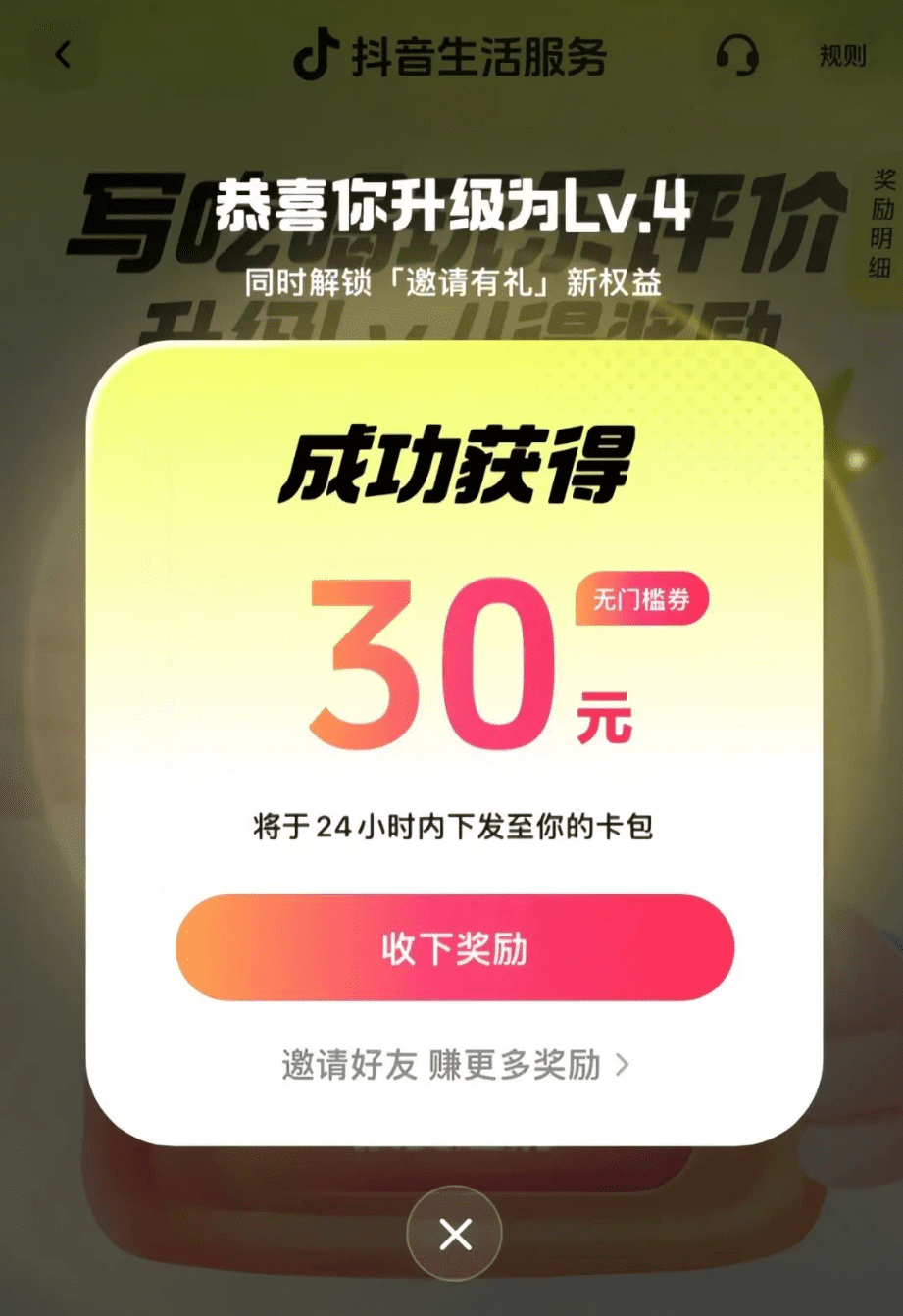 通过上述流程达到Lv4等级后,平台会自动发放面值30-50元的无门槛优惠券,可用于平台消费抵扣。