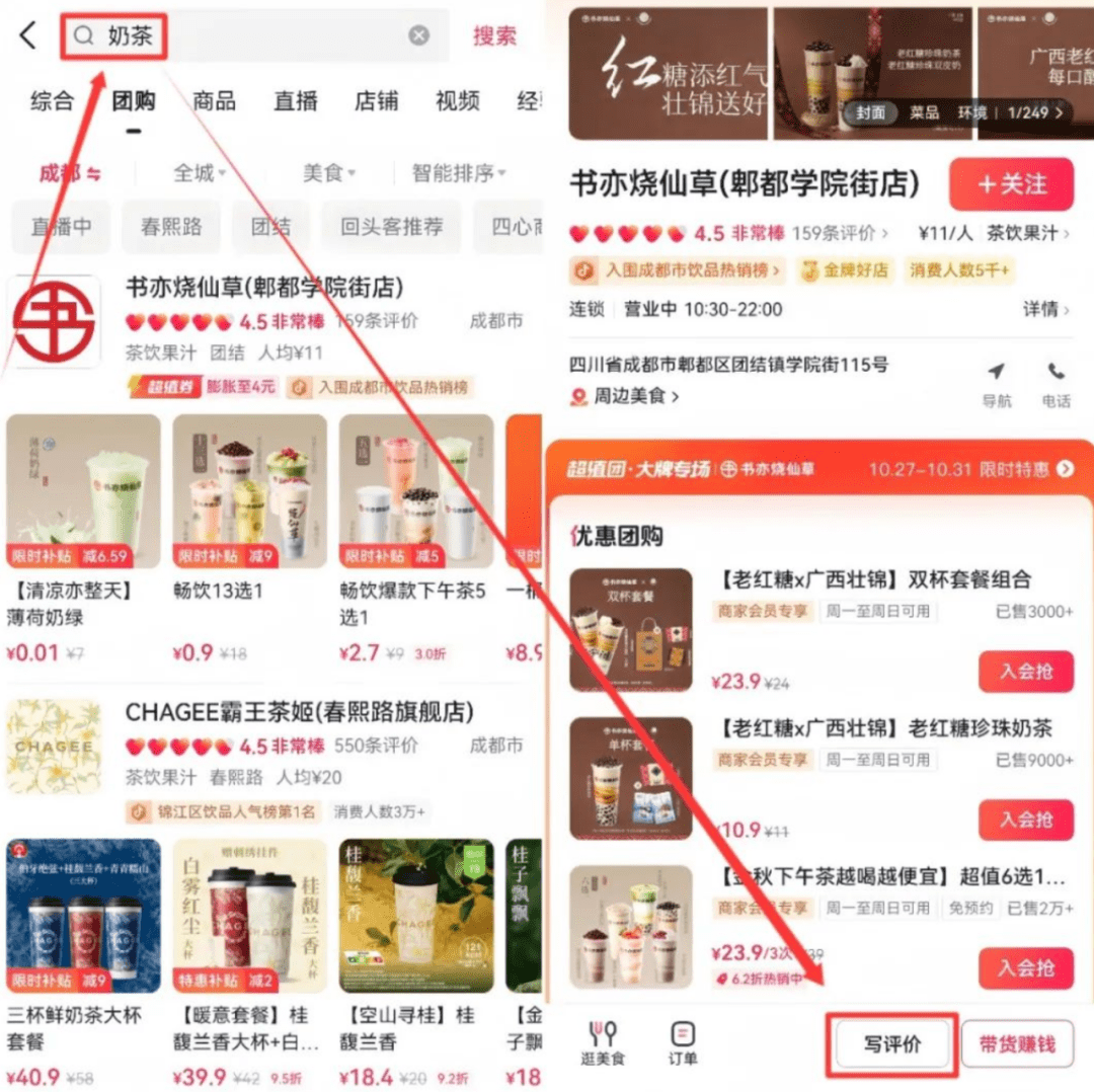 接下来在抖音搜索“奶茶”等餐饮关键词,随机打开一家店铺,点击进入团购页面并找到“写评价”按钮。