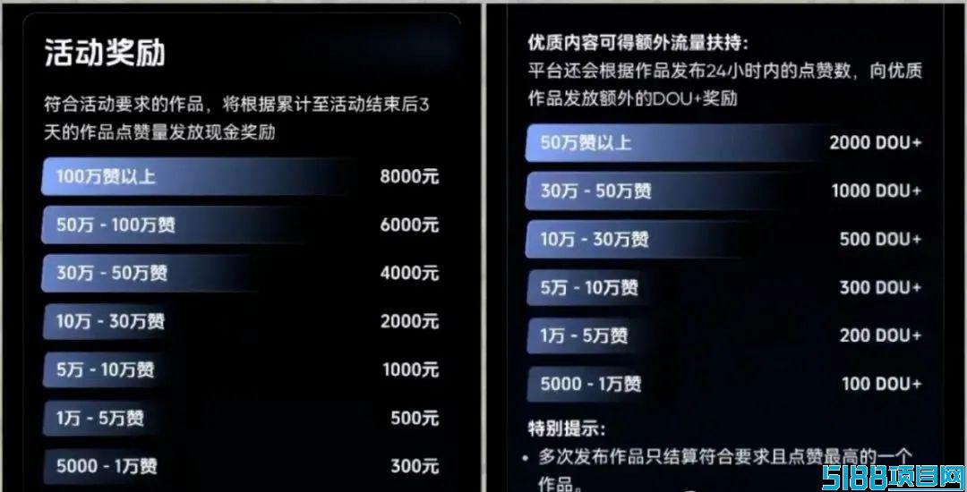 这个推广计划收益主要靠点赞量,一千点赞有150元,一万点赞则有500元,一条视频最高能赚到8000+。