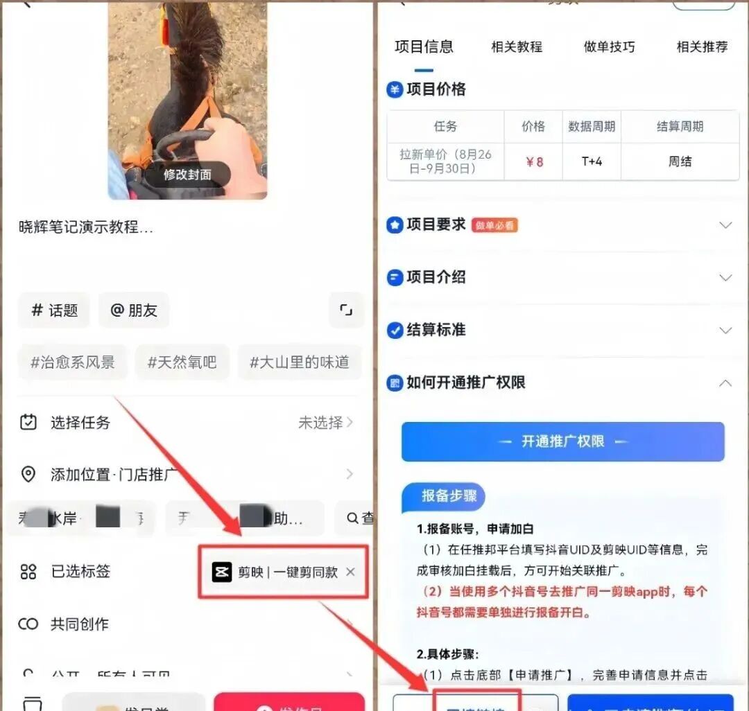 1. 关联模板:发布时必须选择对应的剪映模板,否则白干2. 回填链接:把视频链接填回任务平台,不填没收益3. 优化标题:加上#剪映模板 #一键剪同款 等标签4. 选对时间:早7-9点、晚7-10点发布效果最好