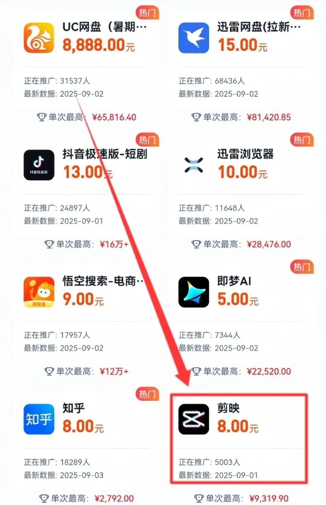 剪映是字节跳动旗下的视频剪辑工具,为了快速占领市场,他们推出了一个推广计划:每成功推广一个新用户使用剪映模板,推广者获得8元奖励。