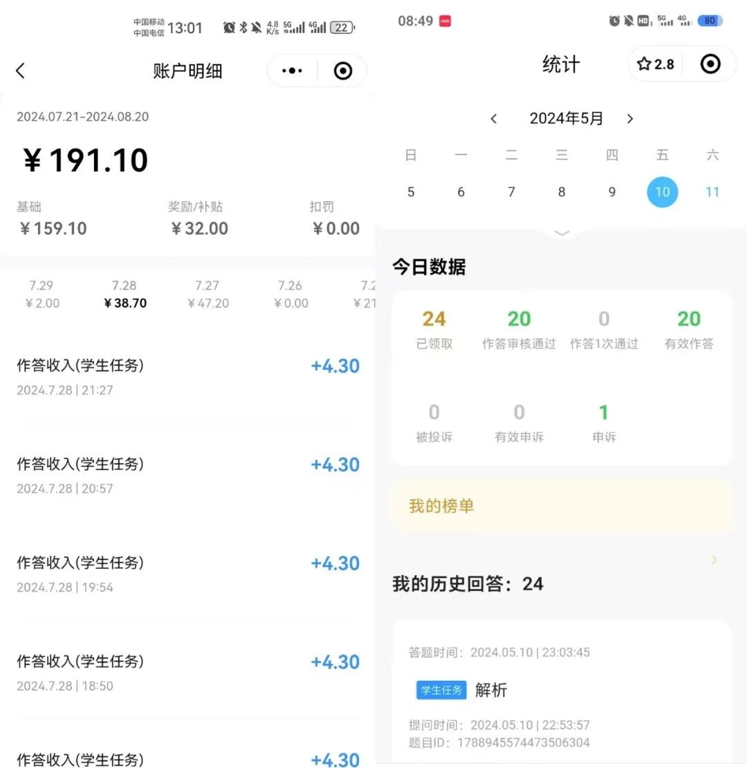 这个适合批改中小学的语数英作业。注册完会有个简单的考试和培训,通过之后就能接单。价格是按份算的,一份最少5元,有时候能到20元,做得多的话一天100元也能实现。