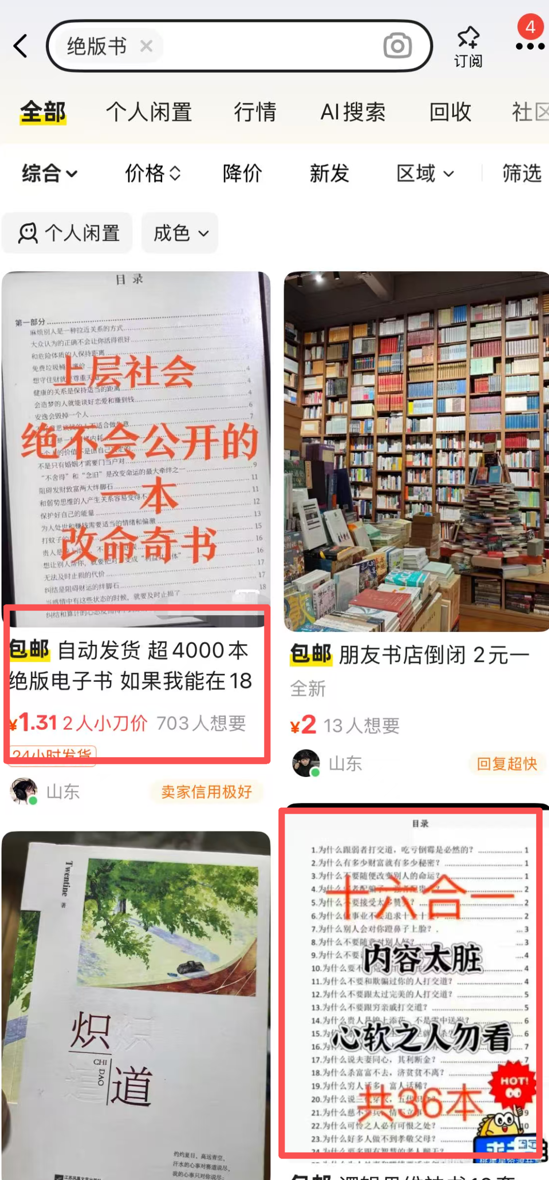 既然卖电子书,首先手里要有大量的电子书资源,某鱼搜索绝版书,就可以找到很多了,很便宜的价格就可以买到几百本。