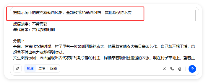 2. 智能体默认的是皮克斯动画风格,如果不想做这个风格的可以让智能体输出提示词,找豆包批量修改提示词,例如