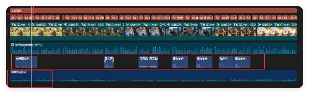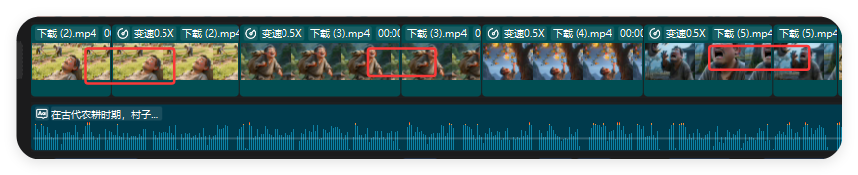 2.生成视频按照音频顺序导入,如果音频短视频长,可以对视频片段调速0.5或者重复使用片段,保证音频和画面匹配
