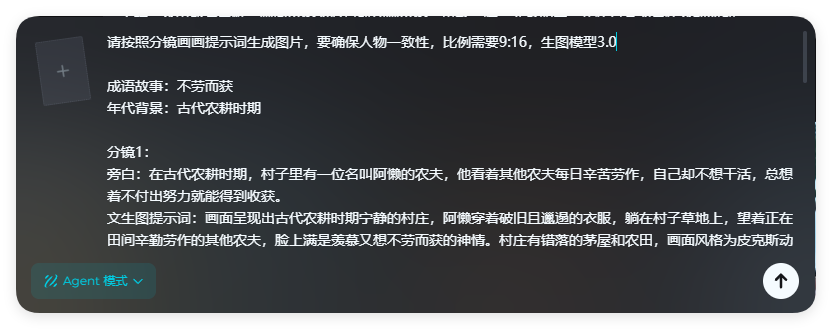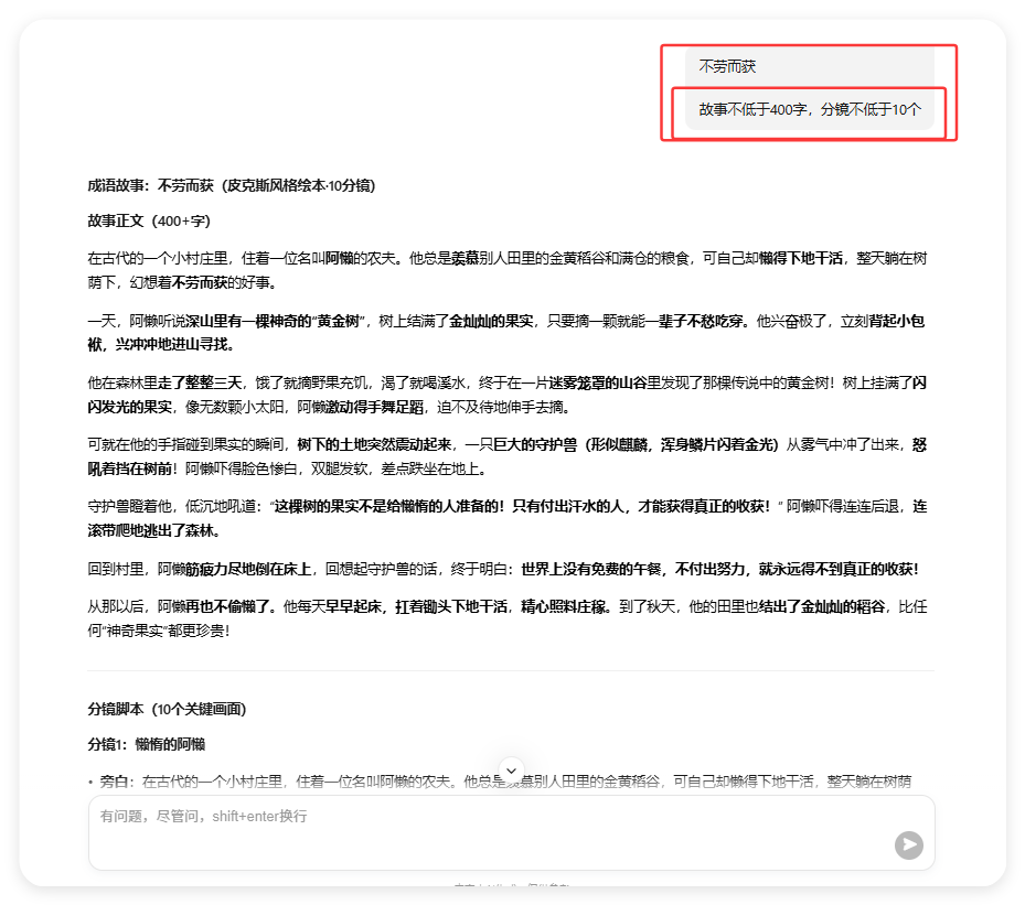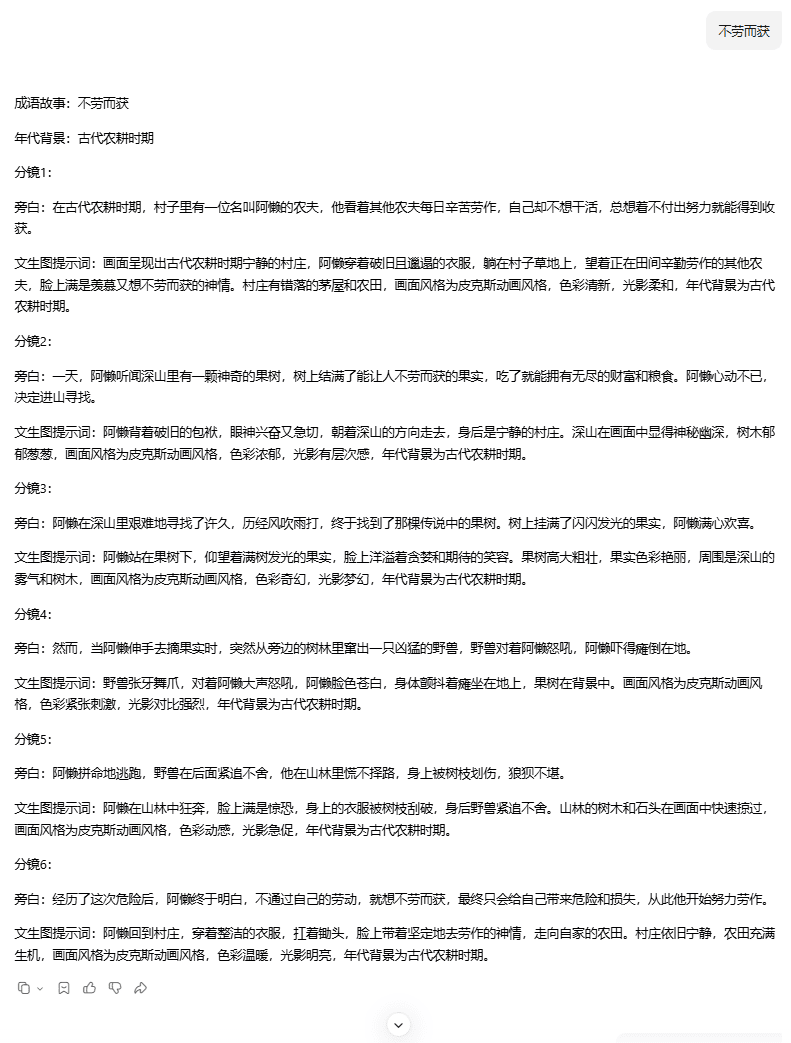 1.打开智能体(文章最后部分自取)输入成语名称,自动输出旁白故事和分镜提示词