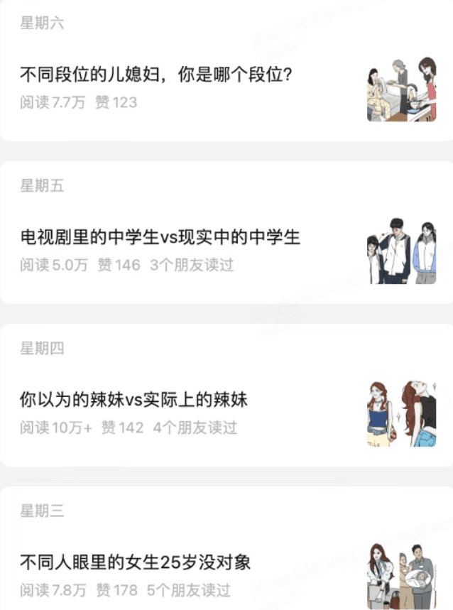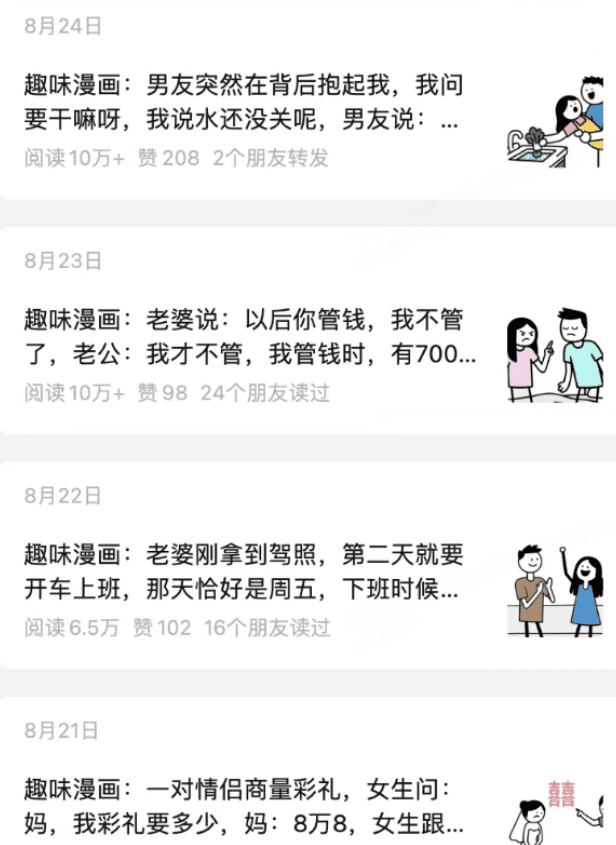 3、对比反差漫画所谓对比类型的漫画图文,其实就是强烈的反差感,营造一种落差感,给人们的休息时间提供一些讨论转发素材,越真实越转发,就能在微信这个生态疯狂传播,点赞评论就能开挂:单身狗 vs 已婚族、月薪3千 vs 月薪3万、白富美 vs 富二代……
