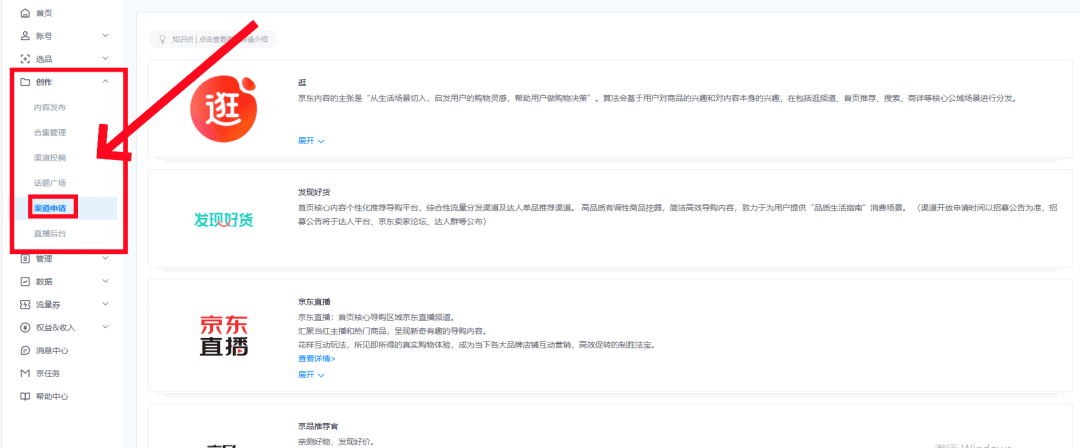 第二步:申请短视频带货的权限申请账号完成之后,依次点击“创作”—“渠道申请”—“申请通过”