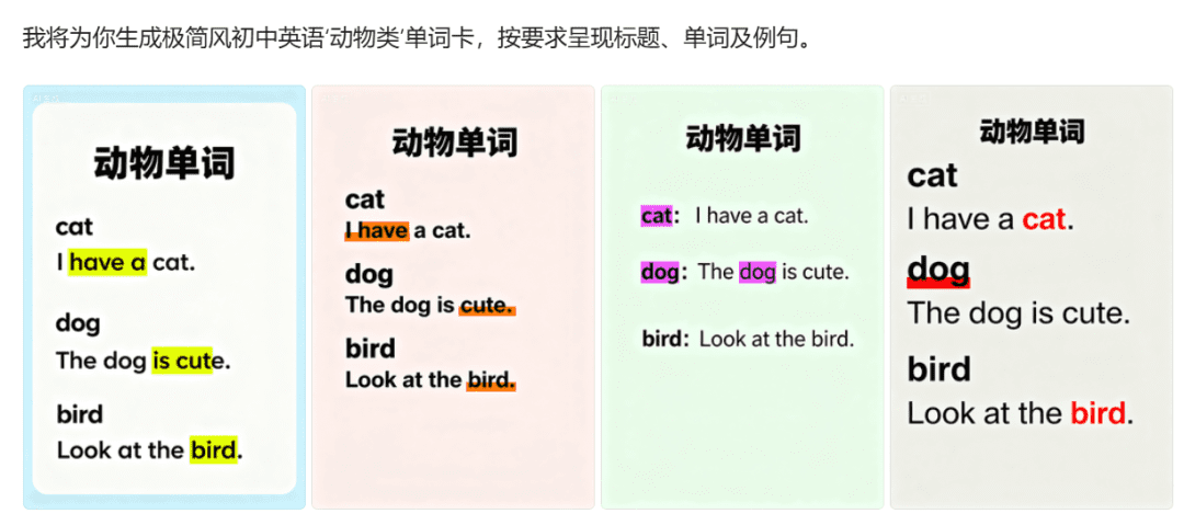 “极简风初中英语‘动物类’单词卡,浅色系背景,标题‘动物单词’加粗,内容列 3 个单词(cat/dog/bird)+ 简单例句并翻译中文,重点词用亮色标亮,无多余装饰,比例 「2:3」