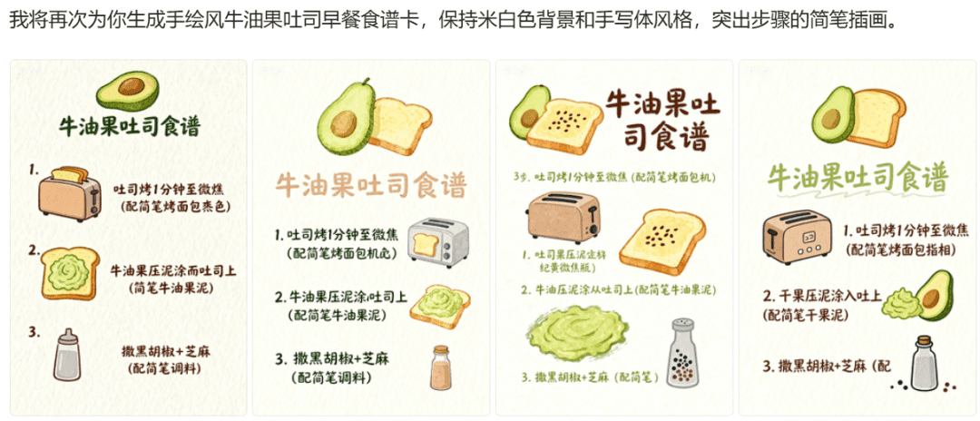 特点仿手写字体 + Q 版简笔画 + 荧光笔标重点,亲切感强;适用做饭步骤、工作流程(如 “推文发布流程”);提示词实例1