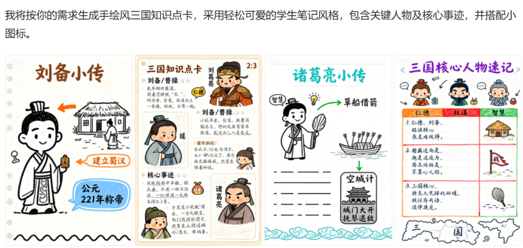 手绘风三国知识点卡,轻松可爱的画风,写 2-3 个关键人物(刘备 / 曹操 / 诸葛亮)+ 核心事迹,加小图标(比如刘备配‘仁德’小标),像学生画的笔记。比例 「2:3」