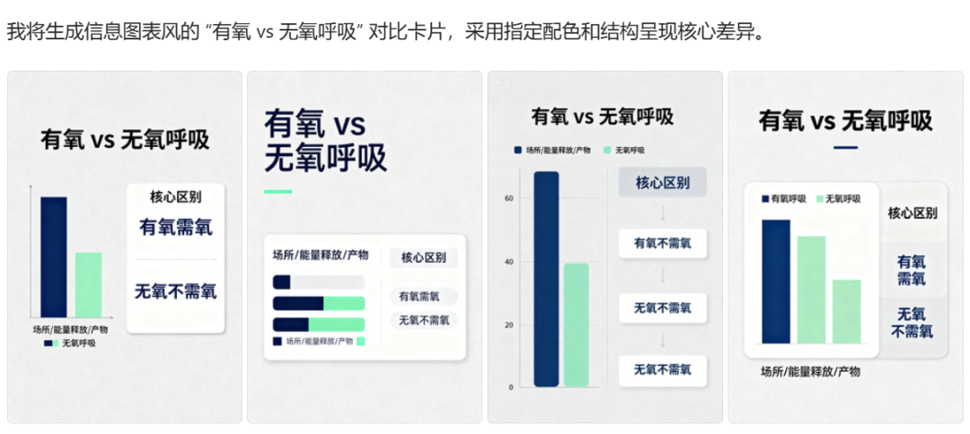 特点图表(饼图 / 条形图)+ 模块化布局,高信息密度不杂乱;适用产品对比、学科知识点对比;提示词实例1“信息图表风‘有氧 vs 无氧呼吸’卡片,左侧条形图对比‘场所 / 能量释放 / 产物’,右侧分模块写核心区别(有氧需氧,无氧不需氧),图表用深蓝 + 浅绿,背景浅灰”;比例 「2:3」