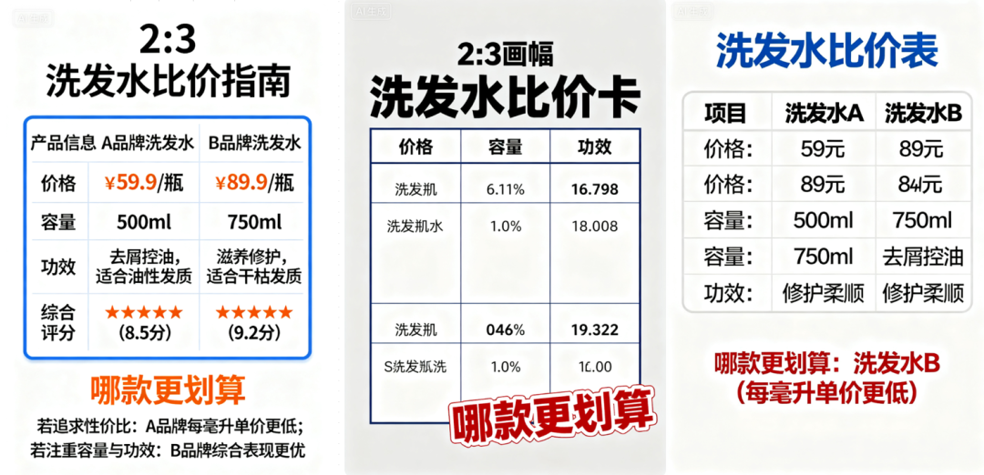 信息图表风 2 款洗发水比价卡,用表格或图表对比‘价格 / 容量 / 功效’,重点写‘哪款更划算’,整体清晰好懂,不用复杂设计,比例 「2:3」