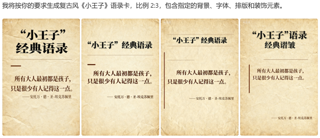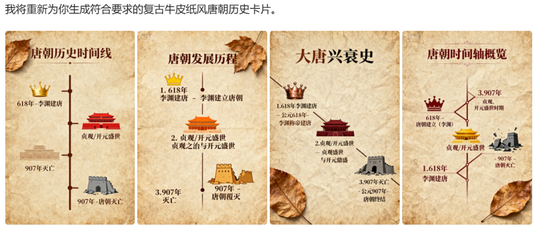 特点牛皮纸背景 + 衬线字体 + 1-2 个复古元素(干树叶 / 旧邮票),有文化感;适用历史时间线、文学解析;提示词实例1复古牛皮纸风唐朝历史卡片,标题衬线体,时间线分 3 段:1. 618 年李渊建唐(皇冠图标);2. 贞观 / 开元盛世(宫殿图标);3. 907 年灭亡(城墙倒塌图标),角落加干树叶”;比例 「2:3」