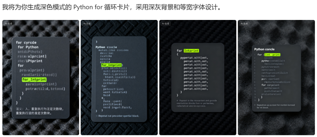 特点深灰背景 + 浅色字体 + 亮色标关键词,科技感强且护眼;适用代码片段(如 Python 循环)、科技产品介绍;提示词案例1深色模式 Python for 循环卡片,深灰背景,代码浅白色,‘for/in/print’亮绿标亮,下方注释‘重复执行指定次数代码块’,字体用等宽字体”;比例 「2:3」