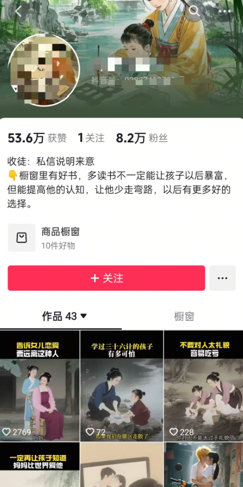 所有内容都是AI生成的,画风是古装家长和孩子你一言我一语地聊天,特别抓人眼球,点赞量一个比一个高。