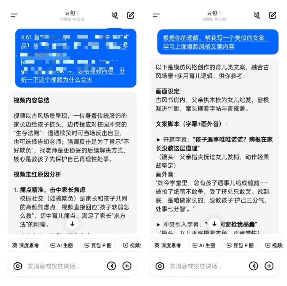 第一步,打开“豆包”App,把那个对标账号的视频链接粘贴进去,让AI帮你“分析”一下它的内容结构。