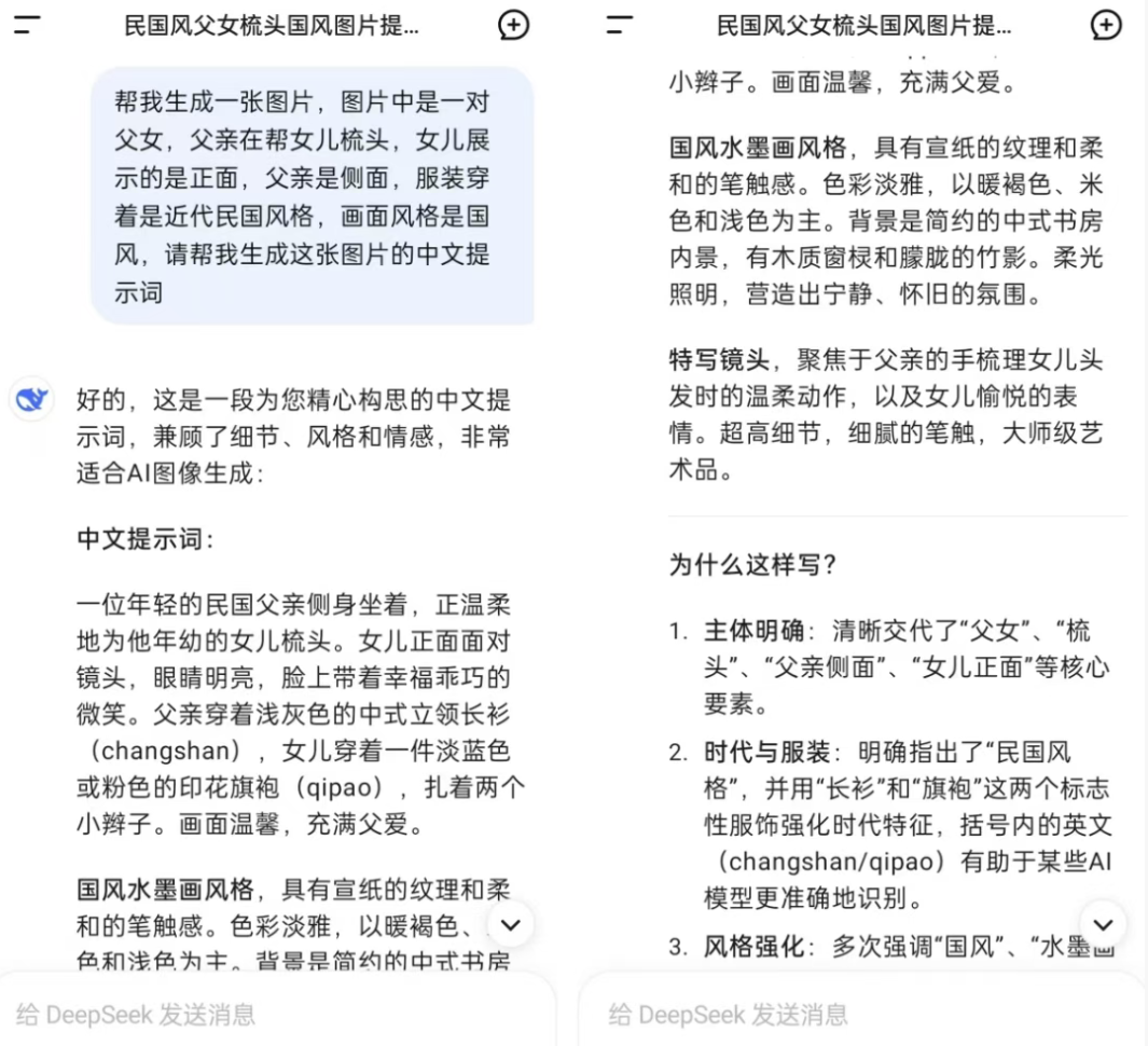 豆包虽然能写文案,但它写的图片提示词太短,效果一般。这时候换“deepseek”上场——你只需要简单描述你想要的画面,让它帮我们生成。