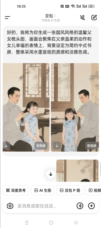 再切回“豆包”,点“AI生成图片”,把刚才deepseek给你的提示词粘贴进去,风格记得选“国风”,然后点生成。挑一张你最顺眼的,直接下载。