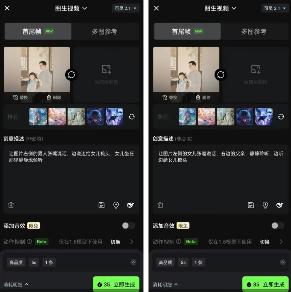 上传你刚从豆包下载的图,再输入对应的提示词——分别生成两个视频