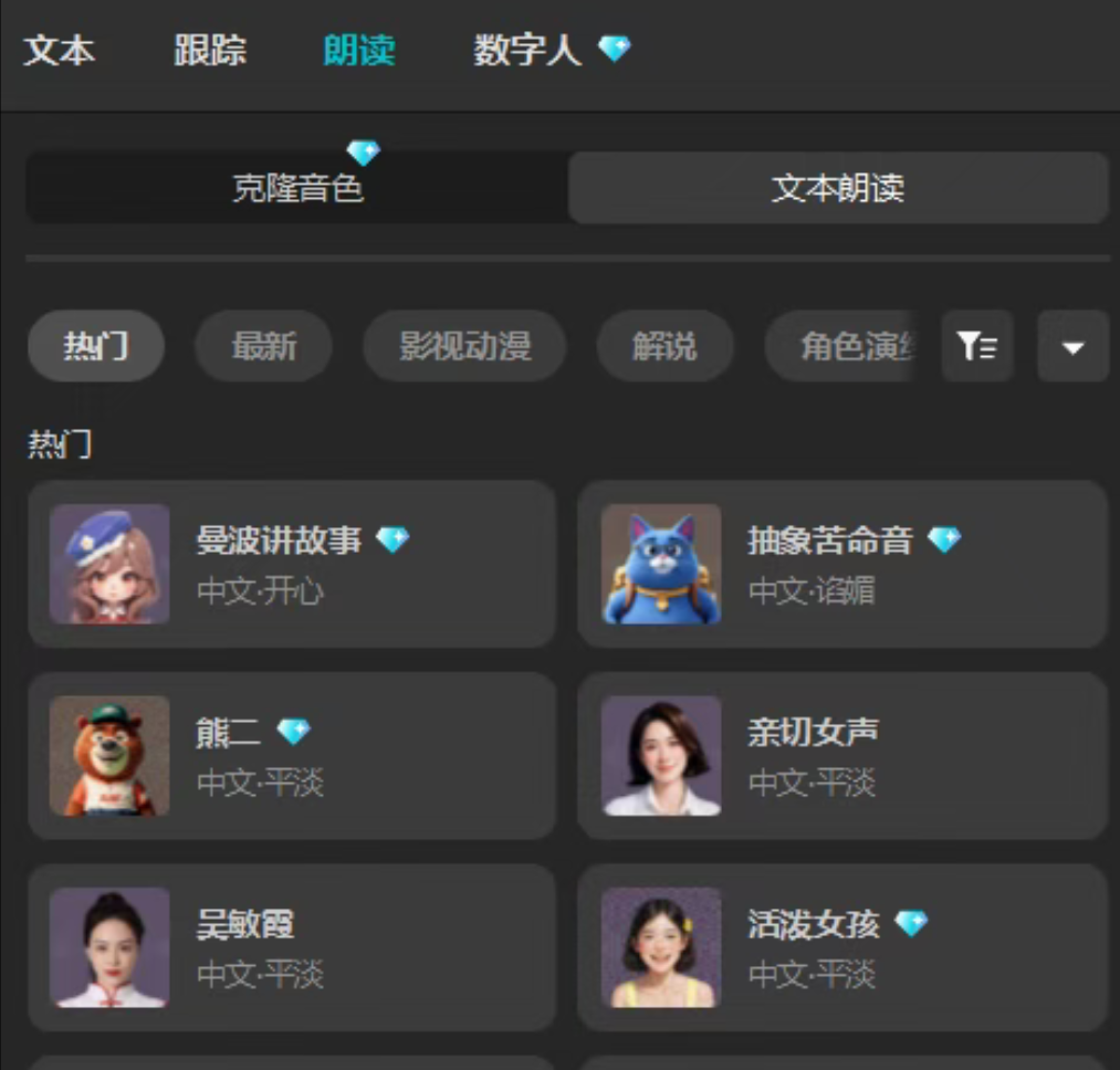 把两个视频导入“剪映”。用它的“文本朗读”功能,把对话一句一句念出来——爸爸的部分选“男声”,女儿的部分选“童声”。