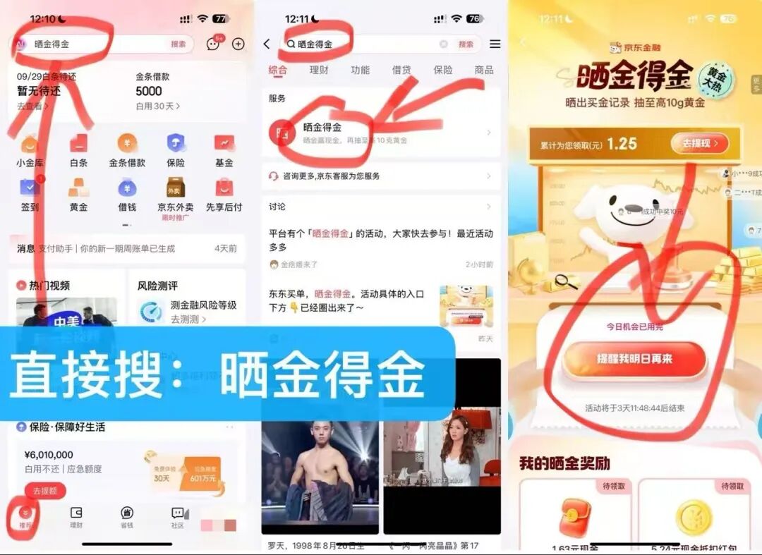然后,在首页搜索框输入关键词“晒金得金”,页面会自动跳转到活动页面;