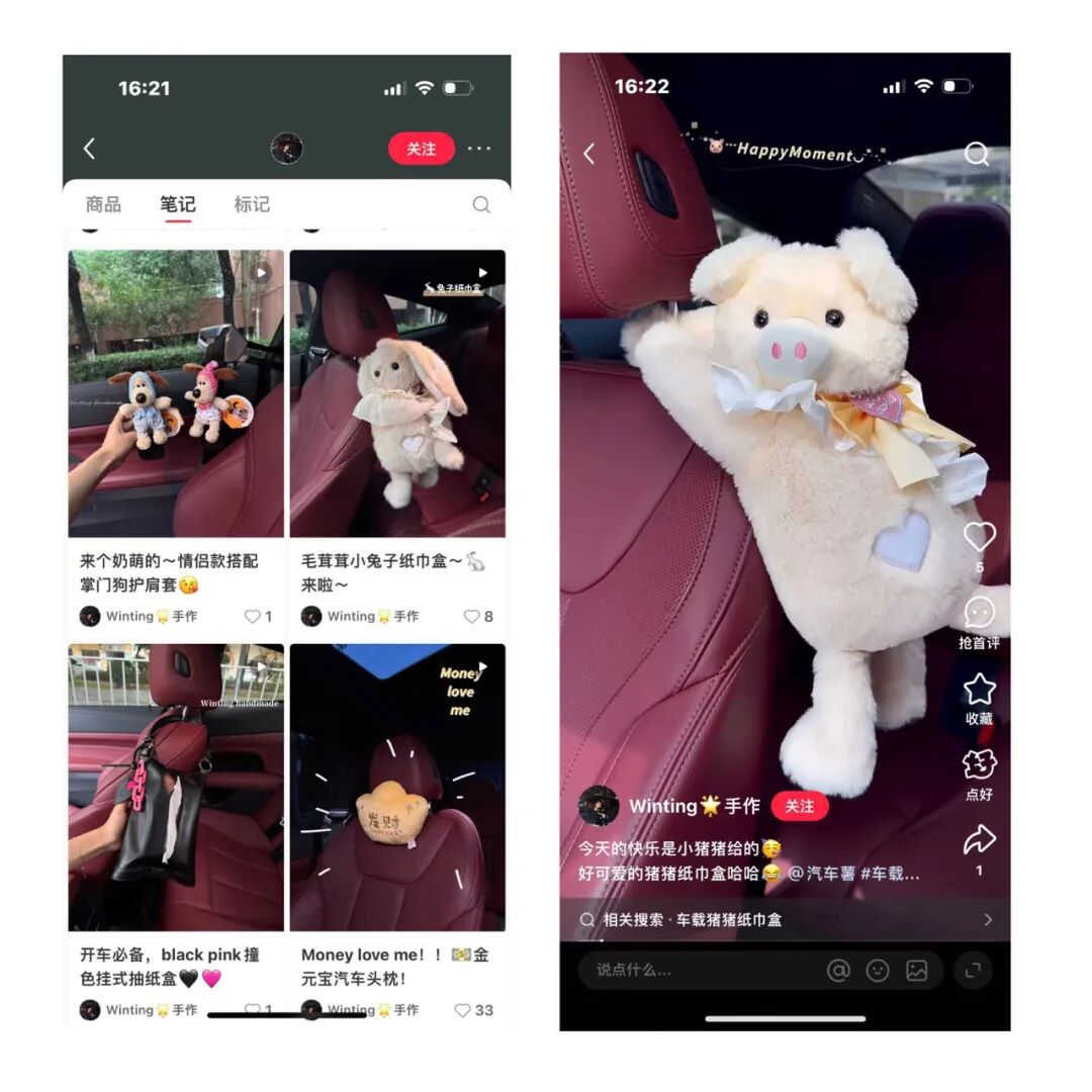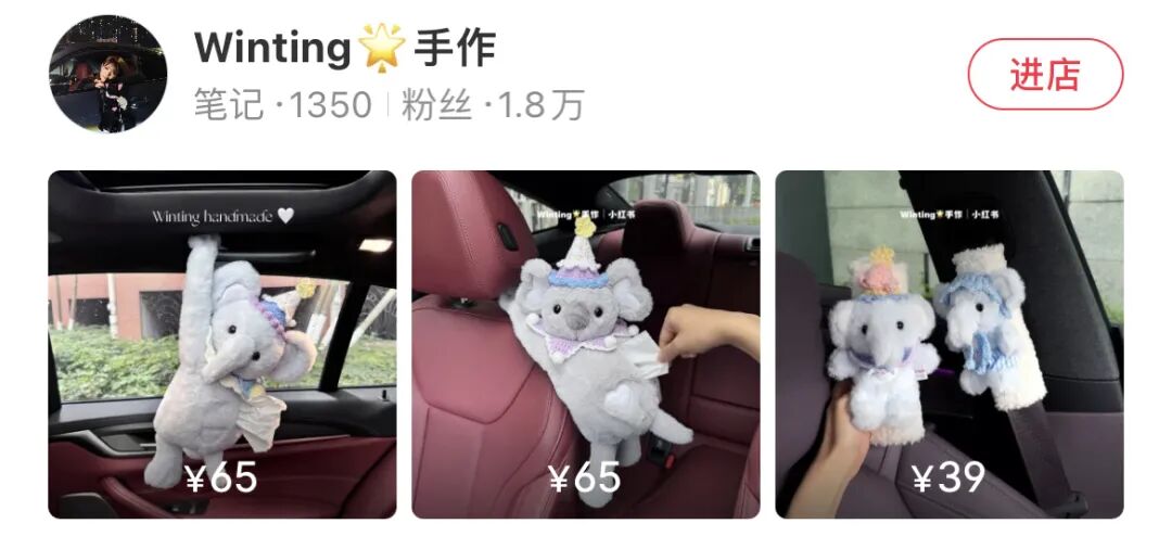 @Winting 手作这个带货店铺聚焦车载手作装饰品,所有笔记中产品展示都在真实的汽车内部空间完成。