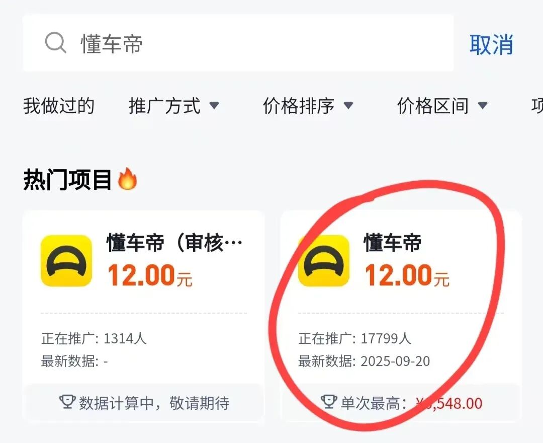 其实懂车帝刚推拉新活动时,我就注意到它的优势:12元/单的单价在同类项目里算高的,而且门槛极低,用户只需下载APP,搜索你专属的关键词,就算完成一单转化,全程不用引导下单或注册会员,操作链路特别短。更关键的是,目前用这套思路玩的人还不多,属于还能抢占流量的阶段。