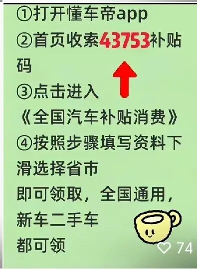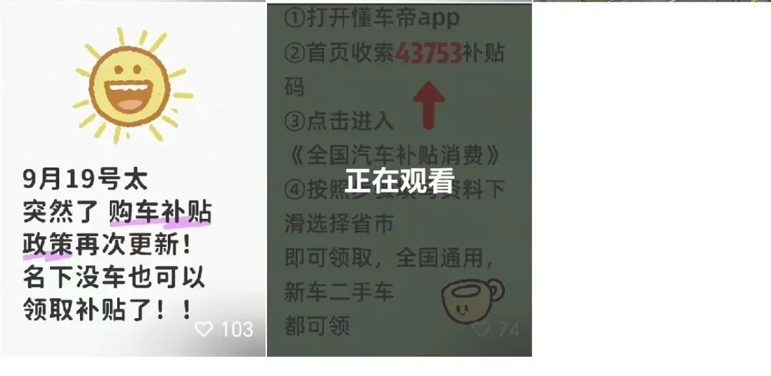 点进这些账号看作品,你会发现一个规律:几乎所有高转化的内容,都是3-4张图片的图文形式,内容全是围绕“购车补贴”“领优惠”展开,目的就是吸引有买车需求、或对补贴感兴趣的用户。而最关键的是最后一张图——上面会有清晰的操作步骤,包括怎么下载APP、怎么搜索关键词,只不过中间的5位数字会被隐藏。