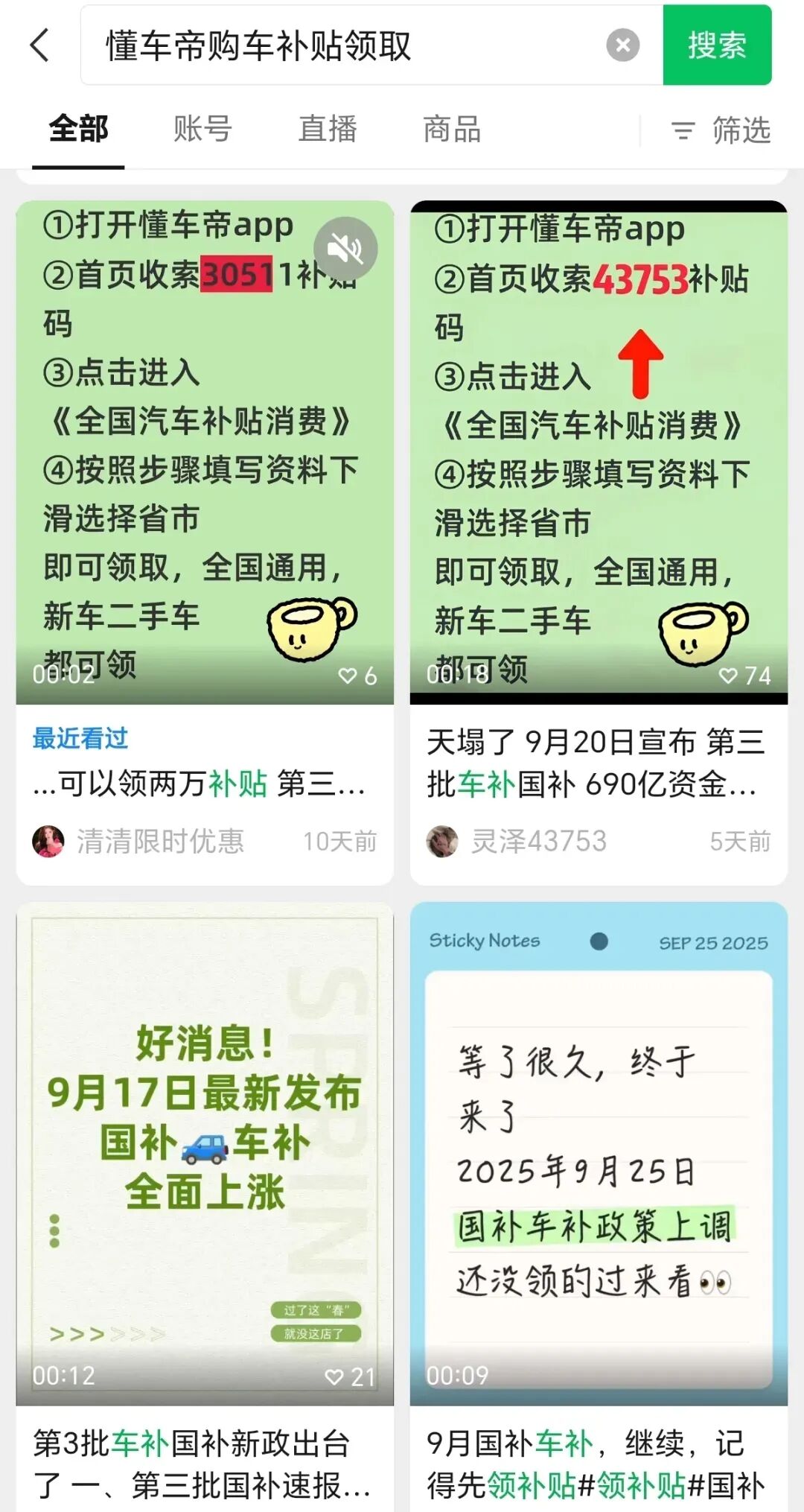 新手最容易犯的错,是自己瞎琢磨内容,浪费时间还没效果。正确的做法是“先模仿再超越”:去视频号、抖音、快手、小红书这些平台,搜索“懂车帝购车补贴”“懂车帝领福利”这类关键词,就能找到一批正在做这个项目的账号。