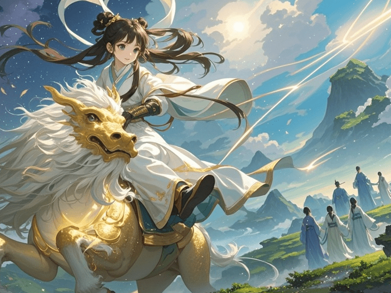 打开即梦,输入提示词:“特写镜头,一位美丽的长发少女,身穿飘逸薄纱长裙,骑在一只散发光芒的麒麟神兽背上,在云雾缭绕的仙境中踏空奔驰,星空与流光轨迹环绕,动态流畅,电影光影,细节精致,4K高清。”