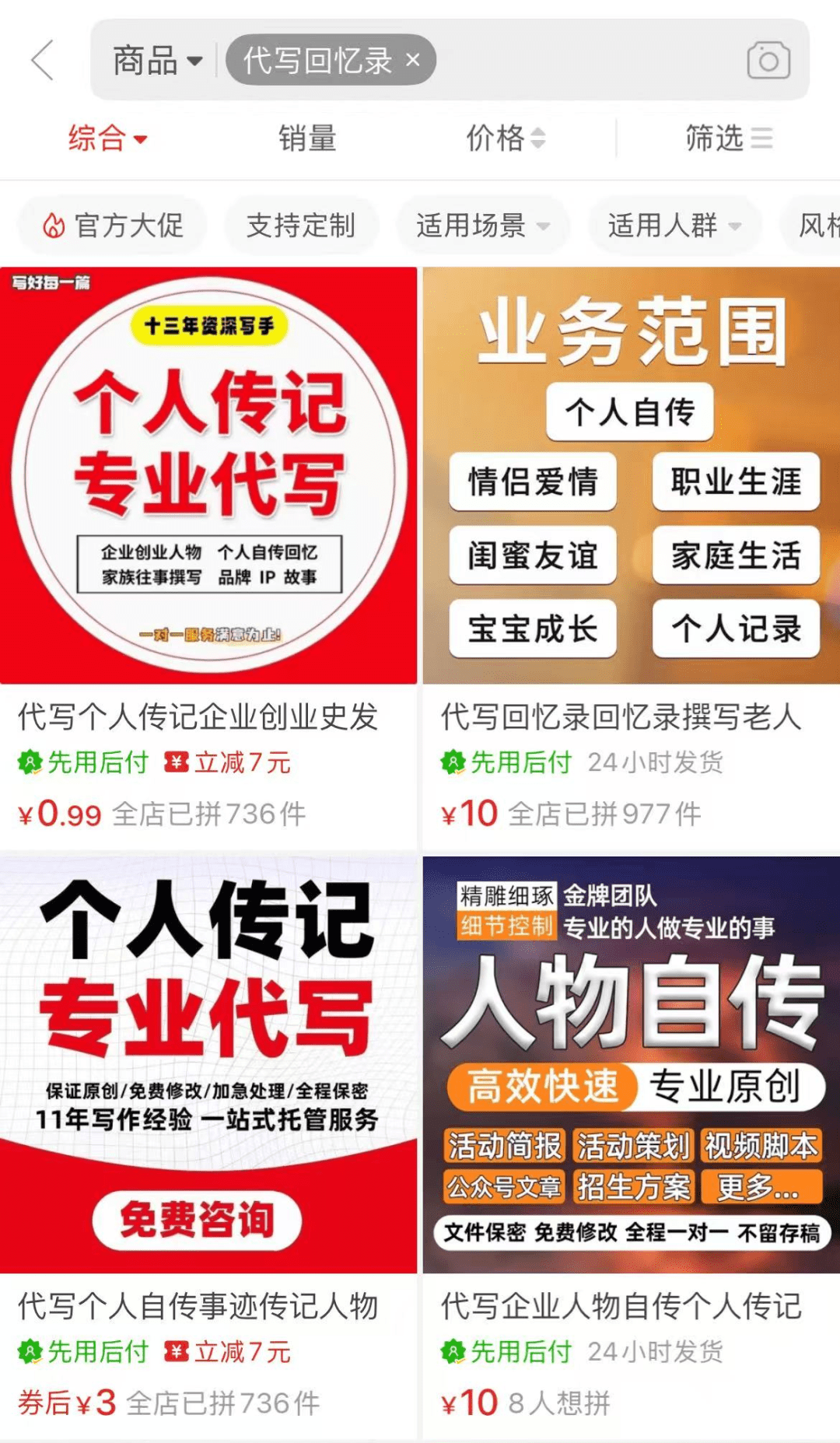 某多上搜索“代写回忆录”,也能看到有人在做,虽然销量不是很多,但是客单价高,一般都是1-2万起步的。