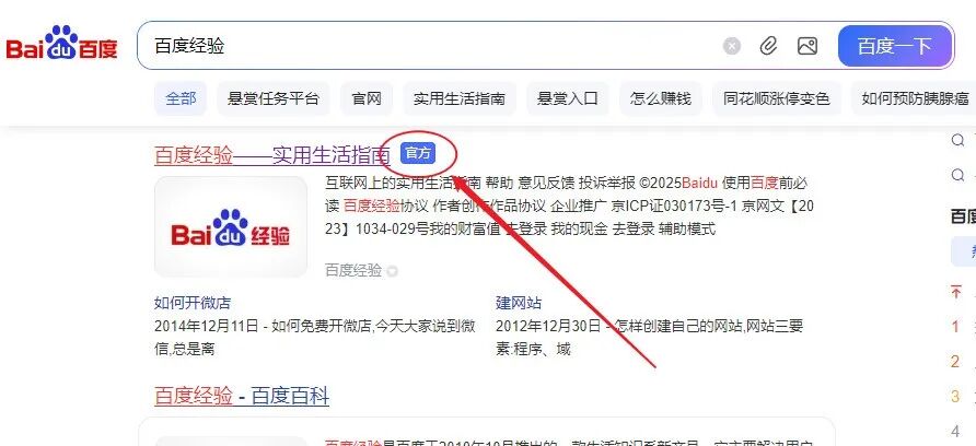 百度搜索“百度经验”,找到后面带有官方标识的点进去,如下图。