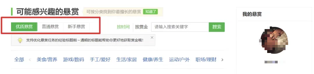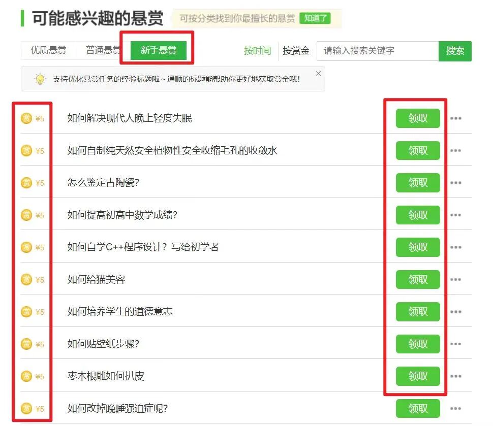 优质悬赏和普通悬赏的问题不多,一般抢不到,我上午9:00进去都提示我“今日问题已被领完,明天记得早来”,所以我们只能做新手悬赏,如下图。