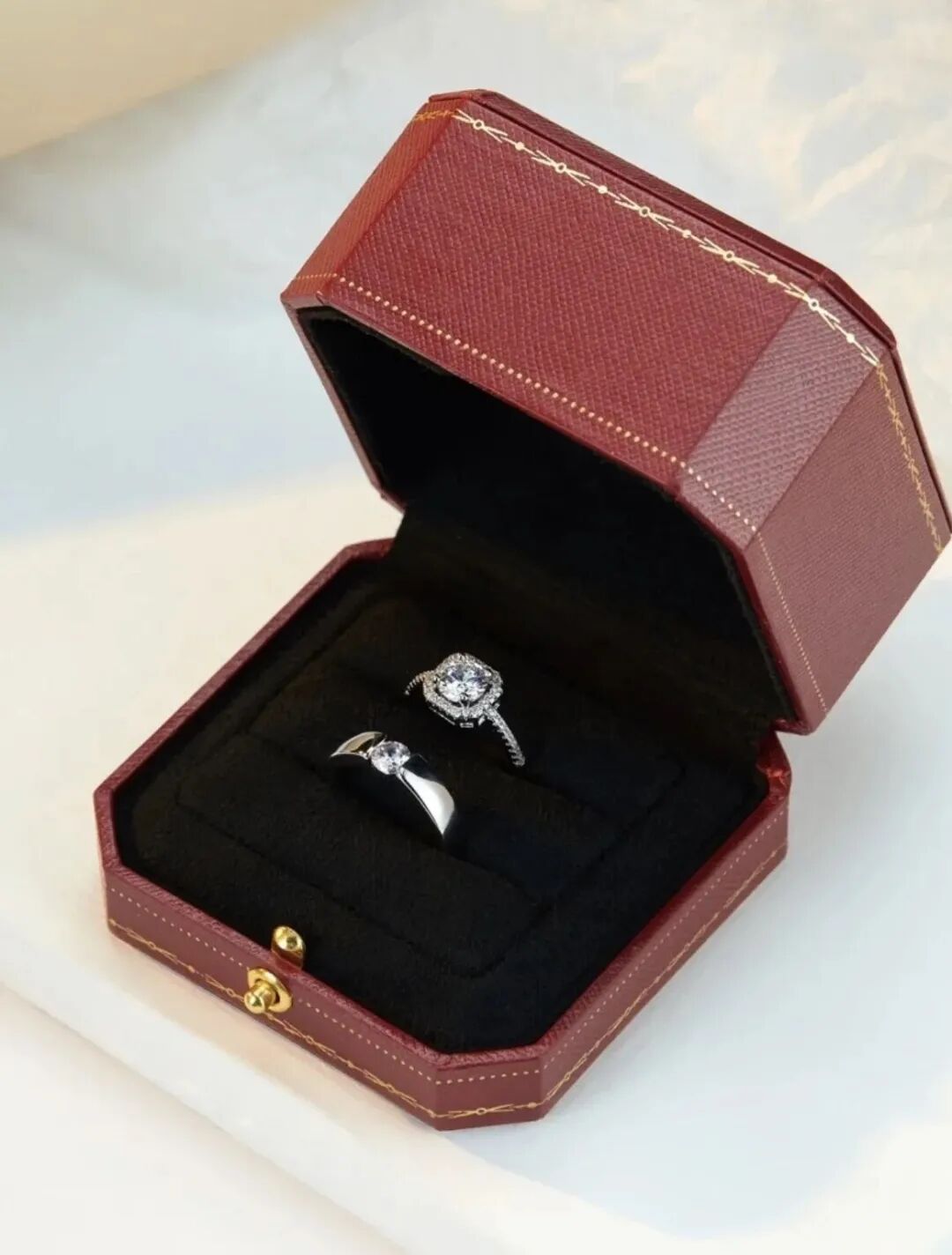 这个账号的素材图都是手机直出,没有什么拍摄难度,生活化、真实感强,多在居家环境、自然光下拍摄。拍摄特写镜头居多,重点展示戒指的切割面、闪耀度和质感(突出仿真钻戒的“以假乱真”),再搭配婚礼相关场景,例如手戴钻戒的互动画面、红色婚戒盒,强化备婚刚需的场景感。