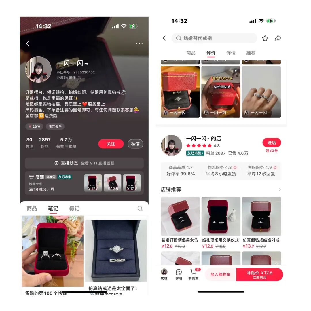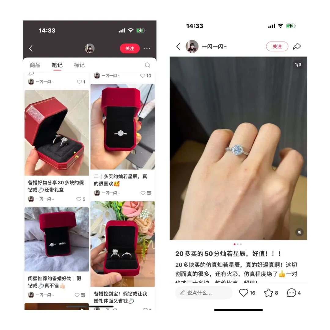 @一闪一闪~这个带货店铺是一个高度垂直、转化路径设计非常清晰的小红书珠宝饰品带货账号,专注于备婚场景下的仿真钻戒/对戒市场。