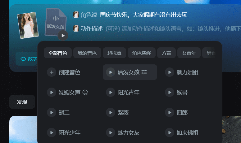 之后选择一个合适的音色,如果需要更精准的画面效果,还可以填写提示词。提示词的格式可以是“镜头运动+角色情绪+说话状态+具体动作+可选(背景描述/其他角色动作等)”。