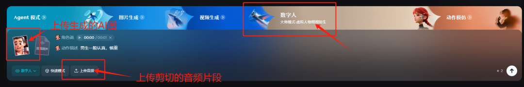 选择“数字人”功能,上传生成的AI图及第一步中切割的音频片段,就可以生成视频啦~