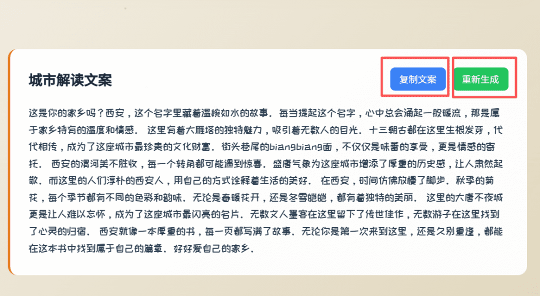 我还添加了 【一键复制】以及【重新生成】按钮【重新生成】这个按钮的主要作用是针对于同一个城市或者某个地方,能生成不同的文案,方便大家的选择【复制文案】这个按钮主要就是方便大家复制,哈哈 另外,还做了几个城市的案例,点击网页右上方的【城市案例】查看即可