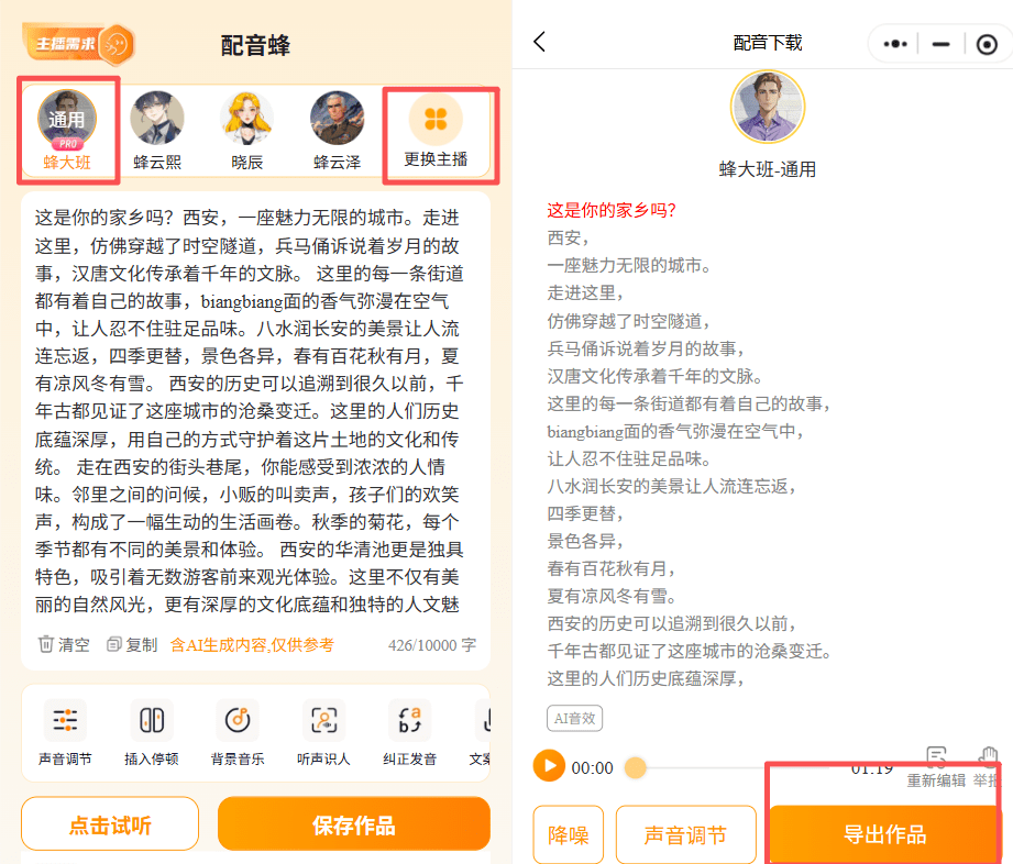 2. 配音打开微信小程序【配音蜂】,将智能体给出的文案复制,选择一个合适的声音我用的蜂大班,你们也可以选择别的昂,这个没啥要求,听起来顺畅就行